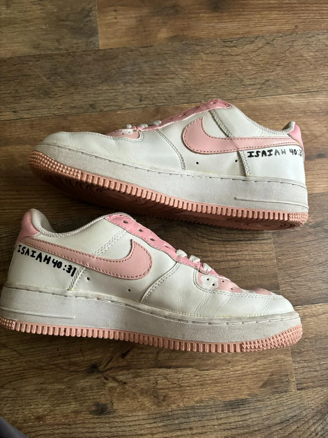 These custom pink Nikes feature a dreamy design with clouds on the front and pink wings on the side, creating a light and airy look. The soft colors and whimsical elements give the shoes a playful vibe.