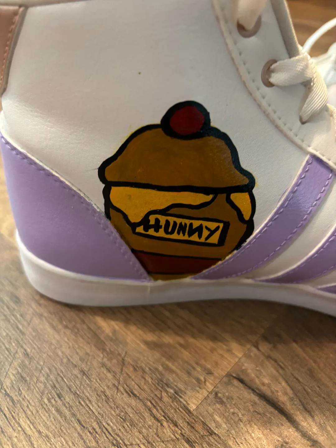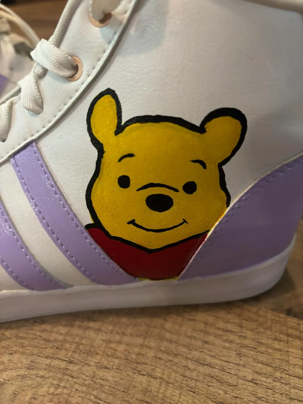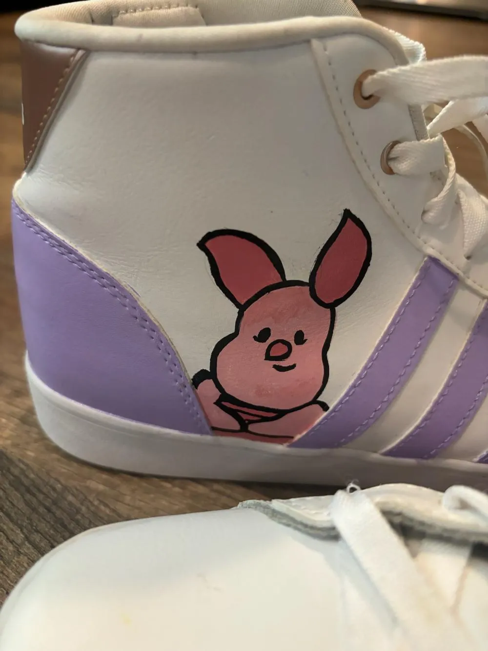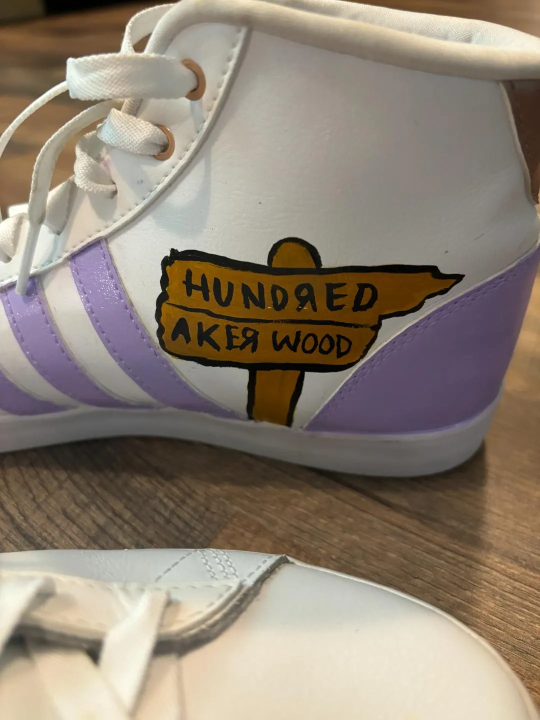 These custom shoes feature a whimsical design with Winnie the Pooh on one side and Piglet on the other. On the inside of the Pooh shoe, there’s a charming hunny pot, while the Piglet shoe showcases a sign for the Hundred Acre Wood. The design incorporates purple Adidas stripes, adding a pop of color that complements the playful characters. Each detail captures the essence of these beloved friends, making the shoes feel vibrant and fun. Creating this design allowed for a blend of nostalgia and creativity, bringing the world of the Hundred Acre Wood to life.
